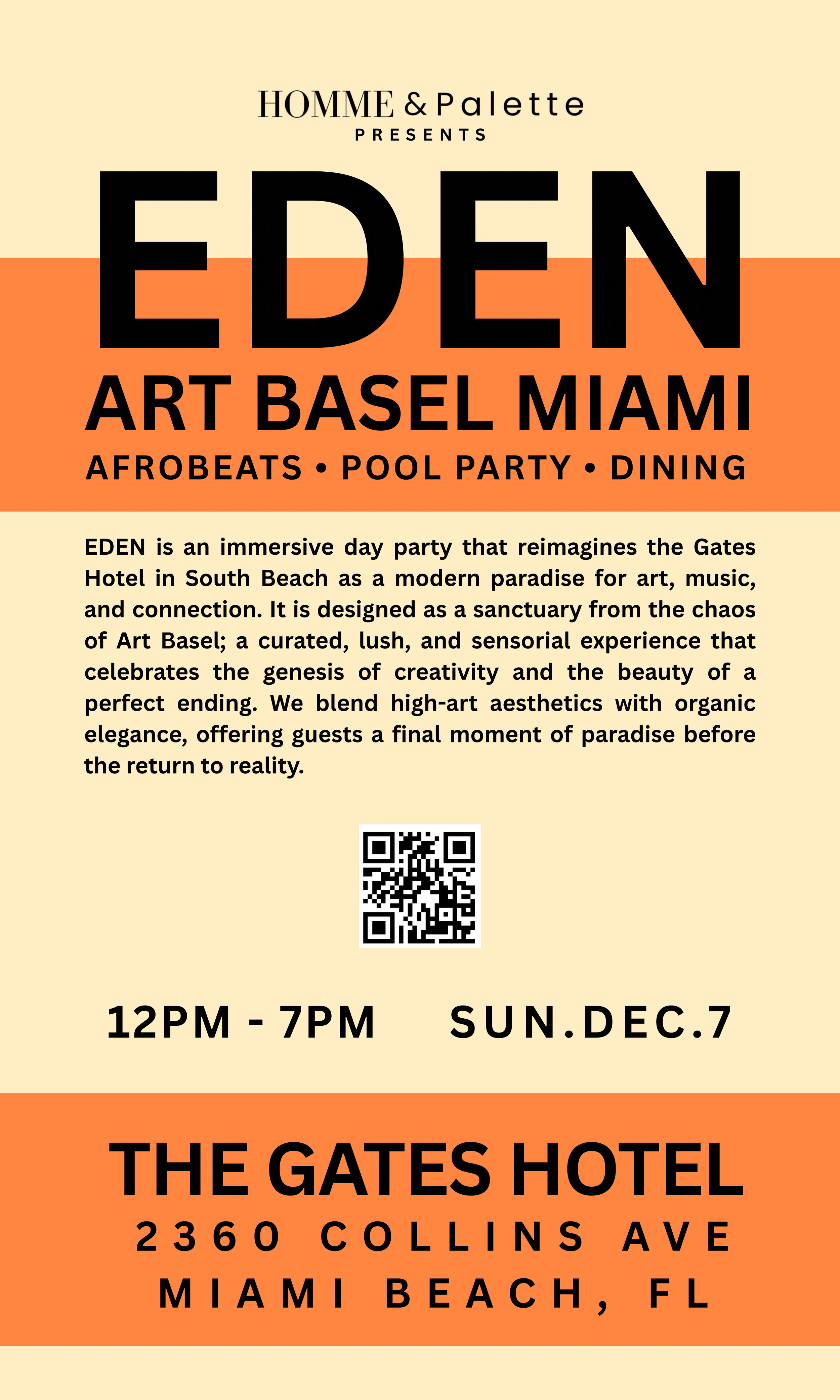EDEN is an immersive day party that reimagines the Gates Hotel in South Beach as a modern paradise for art, music, and connection. It is designed as a sanctuary from the chaos of Art Basel; a curated, lush, and sensorial experience that celebrates the genesis of creativity and the beauty of a perfect ending. We blend high-art aesthetics with organic elegance, offering guests a final moment of paradise before the return to reality.
